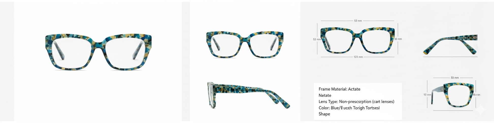 洗練されたスタイルを体現する、美しいブルーのべっ甲柄アセテートメガネ。ブルー、ティール、アンバーの美しいマーブル模様が特徴のフレームは、クラシックなエレガンスと現代的なファッションを完璧に融合させています。