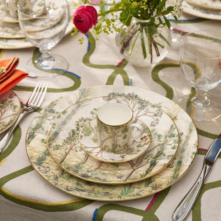 キット・ケンプのゴールド11インチリムラウンドプレートは、背の高い木々をモチーフにしたデザインで、食卓に遊び心のあるアクセントを添えます。エレガントなゴールドのリムと遊び心のある木のモチーフが、毎日の食卓に魅力と個性を添え、まるで森の冒険に出かけたような気分にさせてくれます。どんなシーンもスタイリッシュで楽しい雰囲気で彩ります。